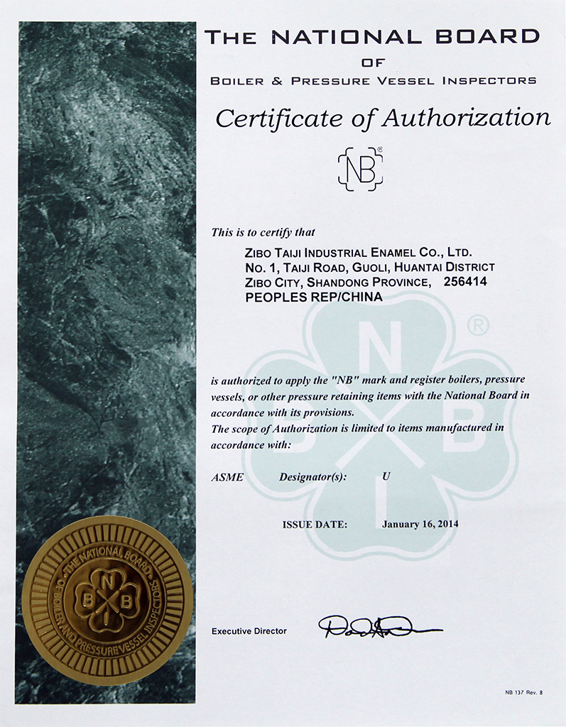 淄博太極在中國(guó)搪玻璃設(shè)備制造行業(yè)中首家通過ISO90001質(zhì)量體系認(rèn)證,并擁有美國(guó)ASME認(rèn)證、歐洲PED認(rèn)證以及國(guó)家部門頒發(fā)的搪玻璃制造許可證、進(jìn)出口許可證和百余項(xiàng)榮譽(yù)證以及三十六項(xiàng)專利等。